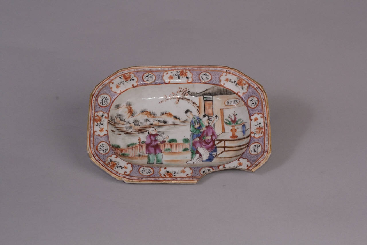 Vassoio fondo per terrina.\nDecoro in stile cantonese a smalti color lavanda: in un giardino una nobildonna seduta su uno sgabello a tamburo è assistita da una dama con ventaglio mentre un bambino le mostra un libro aperto.\nSfondo di rombi color lavanda con puntino al centro.