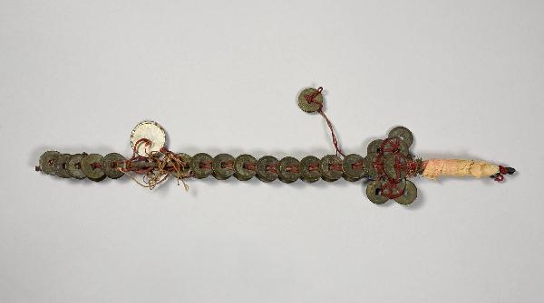 Piccola spada costituita di monete legate con cordoncino rosso su un supporto metallico. L'impugnatura è costituita da un rotolo di carta.