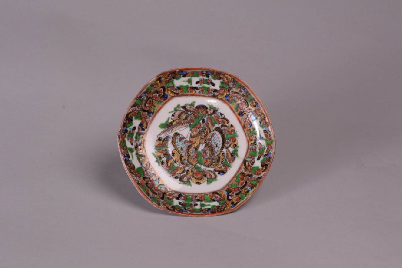 Piattino esagonale di una serie di 6 (C971-973-974-975-976). In porcellana a smalti policromi sopracoperta con decoro di numerose farfalle in volo e banda a motivi floreali.