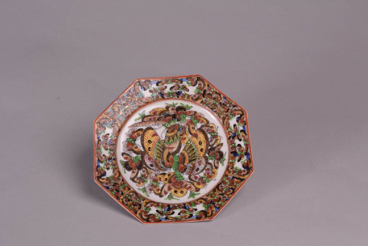 Piattino ottagonale di una serie di 7 ( C984-985-986-987-988-989). In porcellana a smalti policromi sopracoperta con decoro di numerose farfalle in volo e banda a motivi floreali.