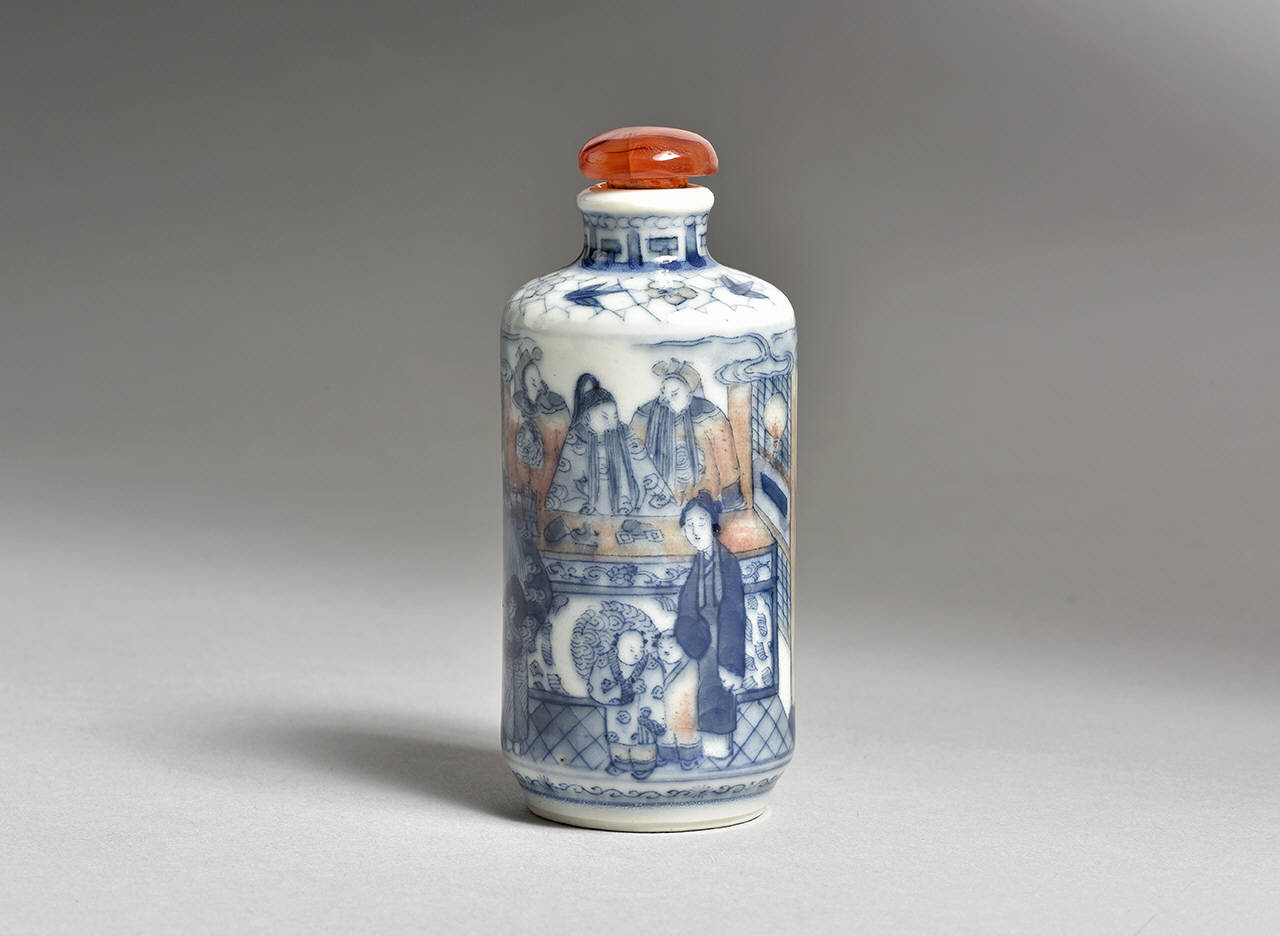 Bottiglietta per tabacco da fiuto cilindrica con piede stretto piede anulare, spalla squadrata, breve collo cilindrico e labbro leggermente everso sormontato da un tappo semisferico di pietra rossa contenente turacciolo e cucchiaino d'avorio. La botiglietta è decorata a smalti sotto coperta blu cobalto e rosso di rame. Sul corpo, al centro, sono raffigurati tre personaggi su una terrazza che da' su un giardino con rocce forate (hu). I tre, sono dietro a un tavolo. Il personaggio al centro, forse un imperatore, indossa una lunga veste e porta capelli raccolti a coda. I due personaggi laterali indossano abiti mandarinali e portano barba e baffi lunghissimi, segno dell'uomo saggio. Di fronte a loro si trovano una dama con due bambini e un quarto personaggio maschile con lunghissima e folta barba. Sulla spalla si alternano quattro fiorellini e altrettante foglie su un fondo "a ghiaccio".