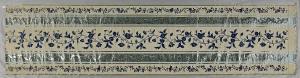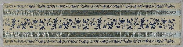Lungo tessuto di seta bianca a strisce azzurre verticali, dipinto sulle zone bianche con tralci fioriti in blu a stampo e sulle strisce azzurre con nastri in argento, ornati da margherite e tulipani stilizzati e alternati, sotto i quali spuntano racemi fioriti. Le cimose sulla lunghezza sono gialle. Un lato corto termina sfrangiato, quello opposto è stato tagliato.