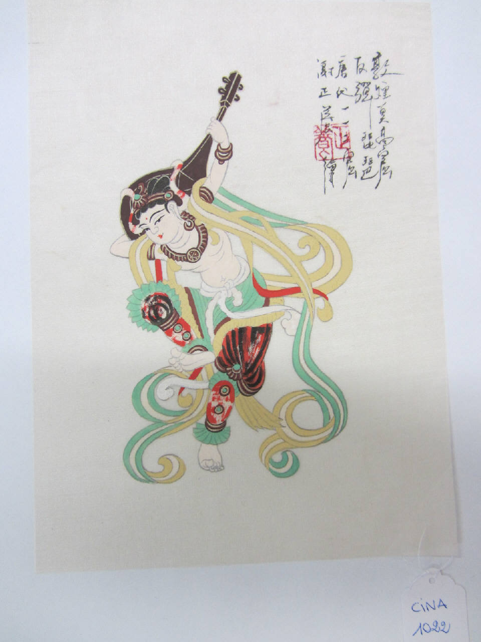 Dipinto raffigurante una "APSARAS", divinità femminile induista, danzatrice divina e ninfa del dio Judra, custode di Kama (dio dell'amore). E' raffigurata con ampio volo svolazzante e con uno strumento musicale (pi-pa).