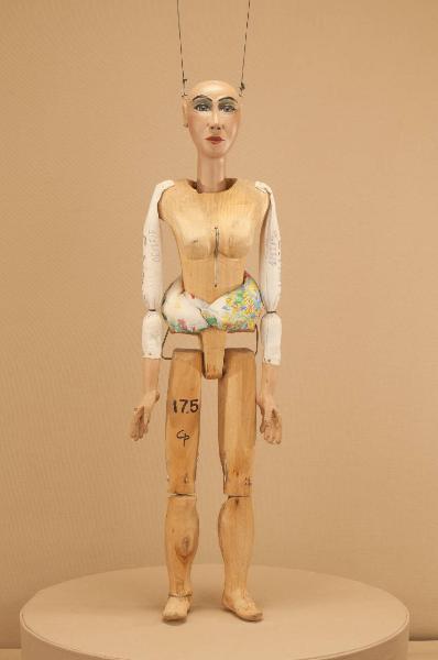 Testa in legno di tiglio fissata al corpo tramite ferro, occhi di vetro. Corpo normale in tiglio. Gambe unite al bacino tramite bordione in ferro, ginocchia ad incastro mobile. Mani in tiglio con dita scolpite ma unite. Bilancino a croce per coppie.