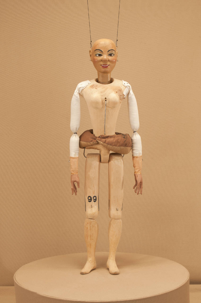Testa in legno di tiglio fissata al corpo tramite ferro, occhi di vetro. Corpo normale in abete. Gambe unite al bacino tramite bordione in ferro, ginocchia ad incastro mobile. Mani mobili in tiglio con dita scolpite e separate. Bilancino a croce metodo Holden.