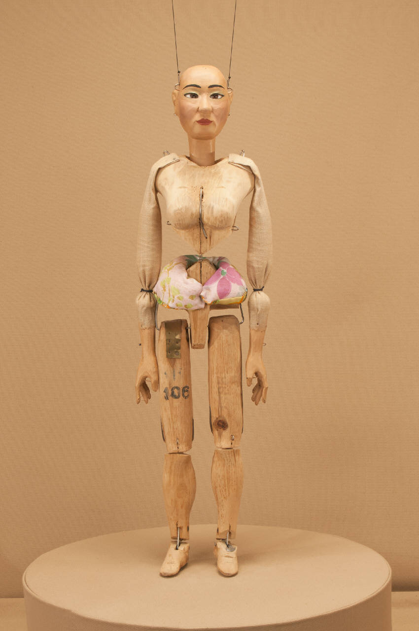 Testa in legno di tiglio fissata al corpo tramite ferro, occhi di vetro. Corpo normale in tiglio tagliato in vita e raccordato con cerniera in metallo. Gambe unite al bacino tramite bordione in ferro, ginocchia ad incastro mobile. Mani in tiglio con dita scolpite e separate. Piedi mobili. Bilancino a croce metodo Holden.