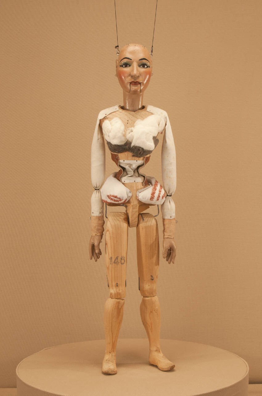Testa in legno di cirmolo fissata al corpo tramite ferro, occhi di vetro. Bocca mobile. Corpo normale in abete tagliato in vita e raccordato con viti ad anello, cuoio e tela . Gambe unite al bacino tramite bordione in ferro, ginocchia ad incastro mobile. Mani mobili in tiglio con dita scolpite. Bilancino a croce metodo Holden.