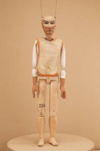 Testa in legno di tiglio fissata al corpo tramite ferro, occhi di vetro. Corpo normale in abete. Gambe unite al bacino tramite bordione in ferro, ginocchia ad incastro mobile. Mani in tiglio con dita scolpite e separate. Bilancino a croce metodo Holden.