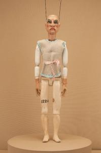 Testa di legno di tiglio fissata al corpo tramite ferro, occhi di vetro, bocca mobile. Corpo normale in abete snodato in vita ad incastro. Gambe unite al bacino tramite bordione in ferro, ginocchia ad incastro mobile. Mani mobili in tiglio con dita scolpite e separate. Bilancino a croce metodo Holden.