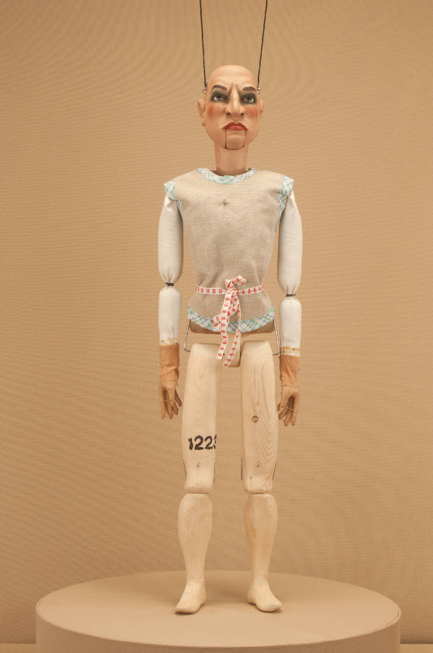Testa di legno di tiglio fissata al corpo tramite ferro, occhi di vetro, bocca mobile. Corpo normale in abete snodato in vita ad incastro. Gambe unite al bacino tramite bordione in ferro, ginocchia ad incastro mobile. Mani mobili in tiglio con dita scolpite e separate. Bilancino a croce metodo Holden.