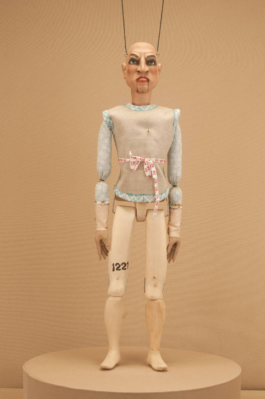 Testa di legno di tiglio fissata al corpo tramite ferro, occhi di vetro, bocca mobile. Corpo normale in abete snodato in vita ad incastro. Gambe unite al bacino tramite bordione in ferro, ginocchia ad incastro mobile. Mani mobili in tiglio con dita scolpite e separate. Bilancino a croce metodo Holden.