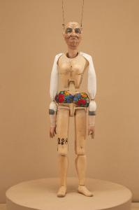 Testa di legno di tiglio fissata al corpo tramite ferro, occhi di vetro. Bocca mobile. Corpo in abete tagliato in vita con incastro. Gambe unite al bacino tramite bordione in ferro, ginocchia ad incastro mobile. Mani mobili in tiglio con dita scolpite e separate. Bilancino a croce metodo Holden.