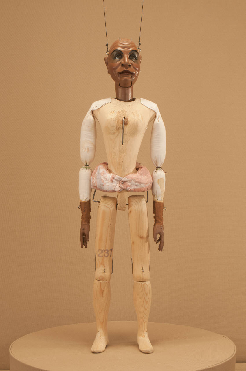 Testa di legno di tiglio fissata al corpo tramite ferro, occhi di vetro. Bocca mobile. Corpo normale in abete. Gambe unite al bacino tramite bordione in ferro, ginocchia ad incastro mobile. Mani mobili in tiglio con dita scolpite e separate. Bilancino a croce metodo Holden.