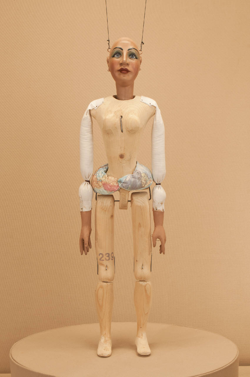 Testa di legno di tiglio fissata al corpo tramite ferro, occhi di vetro. Corpo normale in abete. Gambe unite al bacino tramite bordione in ferro, ginocchia ad incastro mobile. Mani in tiglio con dita scolpite e separate. Bilancino tradizionale per coppie.