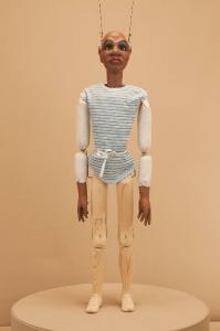 Testa di legno di tiglio fissata al corpo tramite ferro, occhi di vetro. Corpo normale in abete. Gambe unite al bacino tramite bordione in ferro, ginocchia ad incastro mobile. Mani mobili in tiglio con dita scolpite e separate. Bilancino tradizionale per coppie.