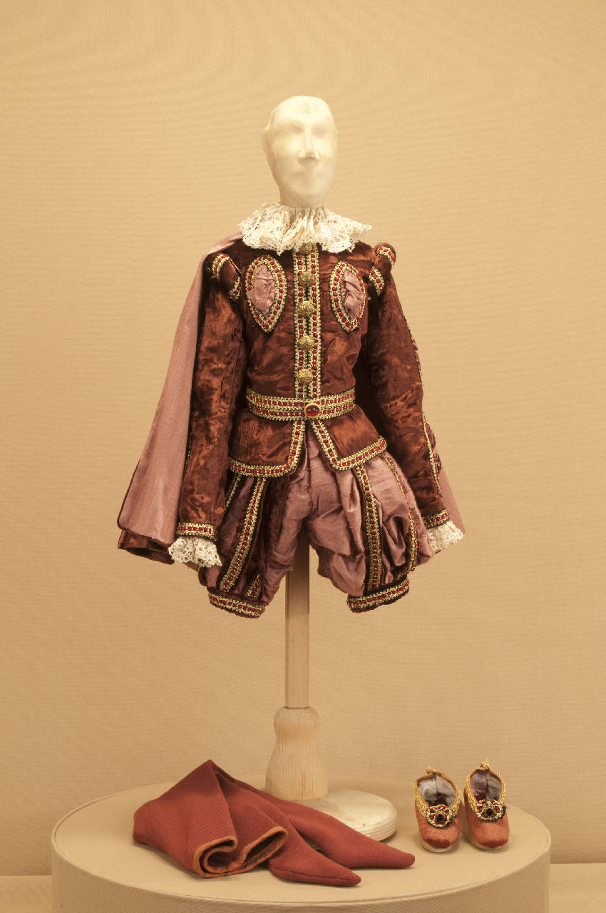 Costume da nobiluomo di foggia seicentesca composto da braghe, farsetto, collo, cintura, calzamaglia, scarpe e mantellina.