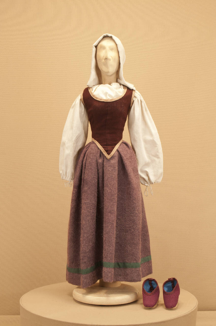 Costume da popolana di foggia seicentesca composto da gonna, camicia, bustino, cuffia e scarpe.