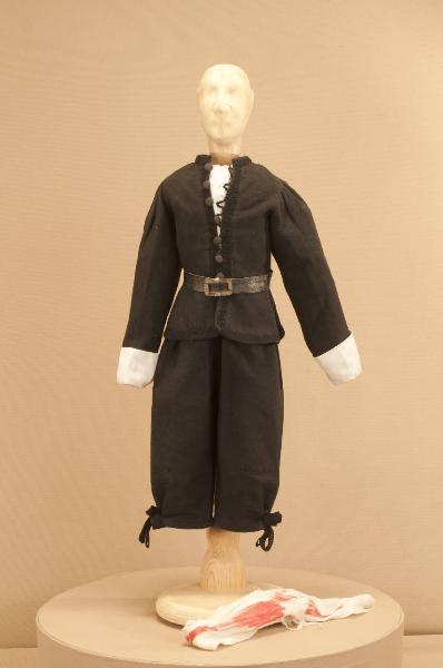 Costume da popolano di foggia seicentesca composto da calzoni, camicia, giacca, cintura e benda insanguinata da usarsi come trucco scenico.