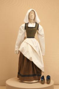 Costume da popolana di foggia seicentesca composto da gonna, camicia, bustino, grembiule, cuffia e scarpe.