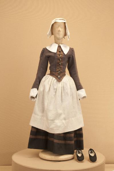Costume da popolana di foggia seicentesca composto da gonna, corpino, collo, grembiule, cuffia e scarpe.