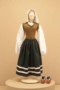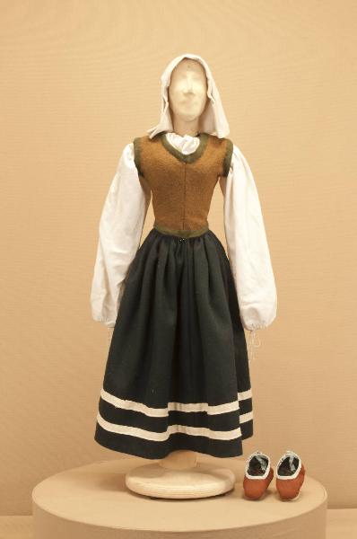 Costume da popolana di foggia seicentesca composto da gonna, camicia, bustino, cuffia e scarpe.