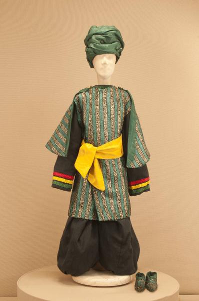 Costume folcloristico orientale composto da pantaloni, corpino, sopravveste, fusciacca, mantellina e scarpe. Il turbante che completa il costume ha il codice GOR 06809.