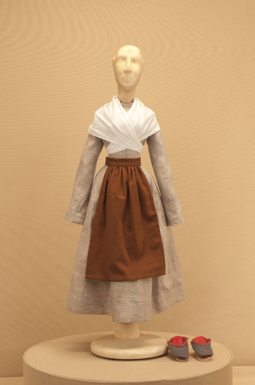 Costume da popolana di foggia seicentesca composto da veste, grembiule, scialle e pantofole.