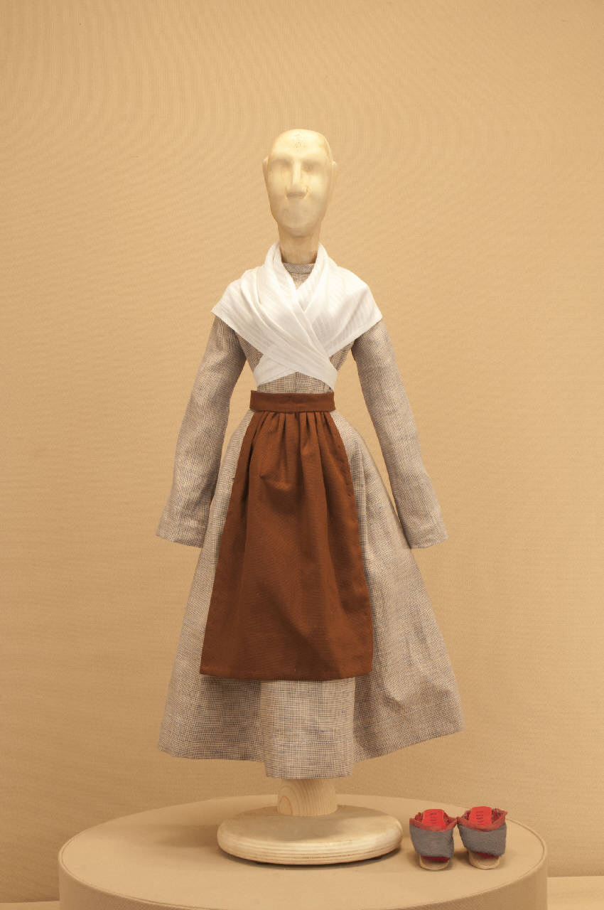 Costume da popolana di foggia seicentesca composto da veste, grembiule, scialle e pantofole.