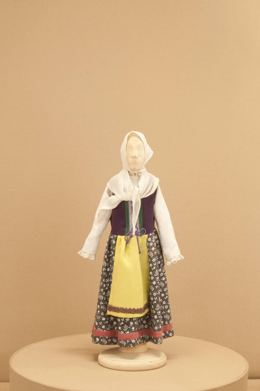 Costume da popolana di foggia seicentesca per figurino composto da veste, sottogonna, fazzoletto da testa e scialle.