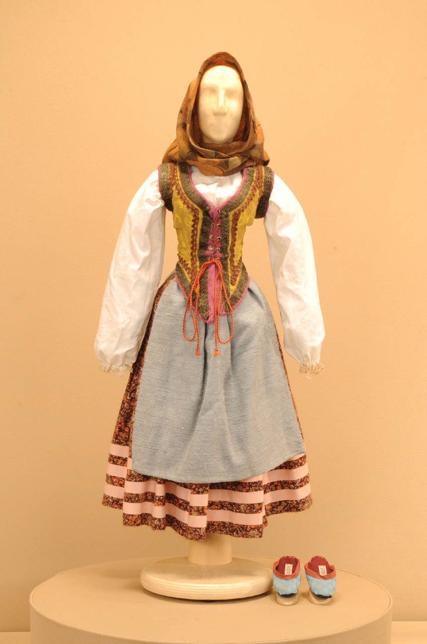 Costume da popolana di foggia seicentesca composto da gonna, camicia, bustino, grembiule, pantofole e scialle.