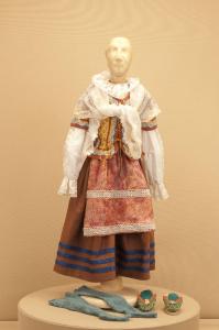 Costume da popolana di foggia seicentesca composto da gonna, camicia, bustino, grembiule, calze, pantofole e scialle.