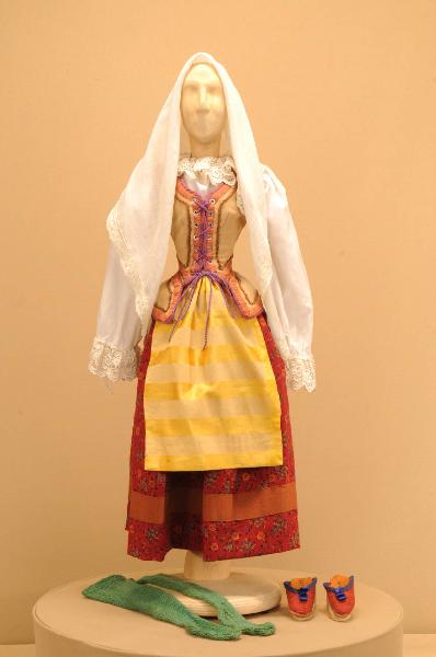 Costume da popolana di foggia seicentesca composto da gonna, camicia, bustino, grembiule, calze, pantofole e scialle.