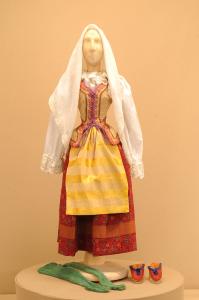 - NOTIZIE STORICO CRITICHE Il costume, che si completa con una raggera, è stato realizzato nel 1996 per un nuovo allestimento dello spettacolo "I promessi sposi" andato in scena al Teatro Ponchielli di Cremona. Il costume, nell'edizione del 2014, è stato utilizzato per una contadina invitata alle nozze. Lo spettacolo entra nel repertorio della Compagnia Colla dopo il 1861, data in cui la Compagnia originaria si divide in tre ceppi. Alla formazione che porta il nome di Compagnia Carlo Colla & Figli viene assegnato, nella spartizione del materiale, il suddetto manoscritto. Ne ritroviamo la titolazione sul Libro Mastro soltanto il 19 Aprile del 1879, nella piazza di Sannazzaro.\nA ricordo di Carlo II Colla lo spettacolo seguiva una traccia piuttosto romanzata e poco fedele alla scritturazione manzoniana. Si chiudeva dopo la processione, poiché di tutto il capitolo che riguardava la peste, essendo questa malattia ancora diffusa tra le popolazioni, non si riteneva opportuno parlare. Nel 1927 Carlo II Colla curò un nuovo allestimento, andato in scena il 30 Aprile nella sala del Teatro Gerolamo, rifacendo molte scenografie e molti costumi, rinnovando ed allargando il vecchio materiale di sartoria. Rimasero così due scene del pittore Luigi Mens ("Interno casa di Lucia", "Palazzotto in Milano di Don Rodrigo"). Per le restanti ambientazioni Carlo II Colla si rivolse al pittore Achille Lualdi che operava già con la Compagnia dal 1911, con il quale si recò sui luoghi manzoniani perché i bozzetti delle scenografie rispettassero la geografia descritta dall¿autore. Nel 1996 Eugenio Monti Colla curò una nuova edizione dello spettacolo rifacendo alcuni costumi, aggiungendo alcuni episodi al testo e sostituendo la musica di Enrico Petrella con quella di Amilcare Ponchielli. Venne anche sostituito il personaggio maschera di Gerolamo, che impersonava Don Abbondio, con un carattere più consono a quello voluto dall¿attore. Nelle edizioni del 2004 e del 2014 è continuata l¿opera di rifacimento di alcuni costumi.