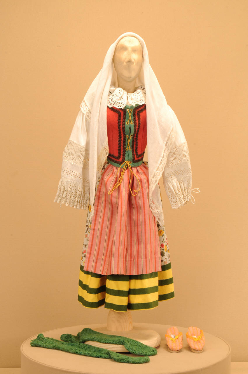Costume da popolana di foggia seicentesca composto da gonna, camicia, bustino, grembiule, pantofole, calze e scialle.