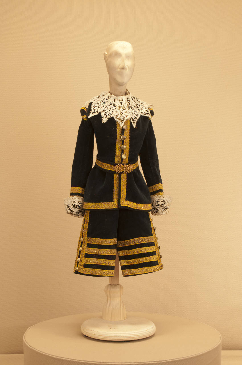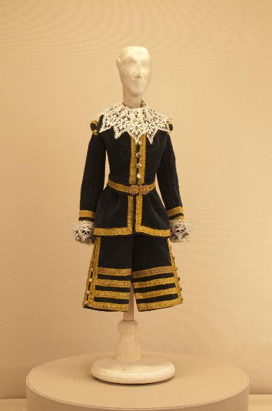 Costume da nobiluomo di foggia seicentesca composto da calzoni, casacca, collo e cintura.