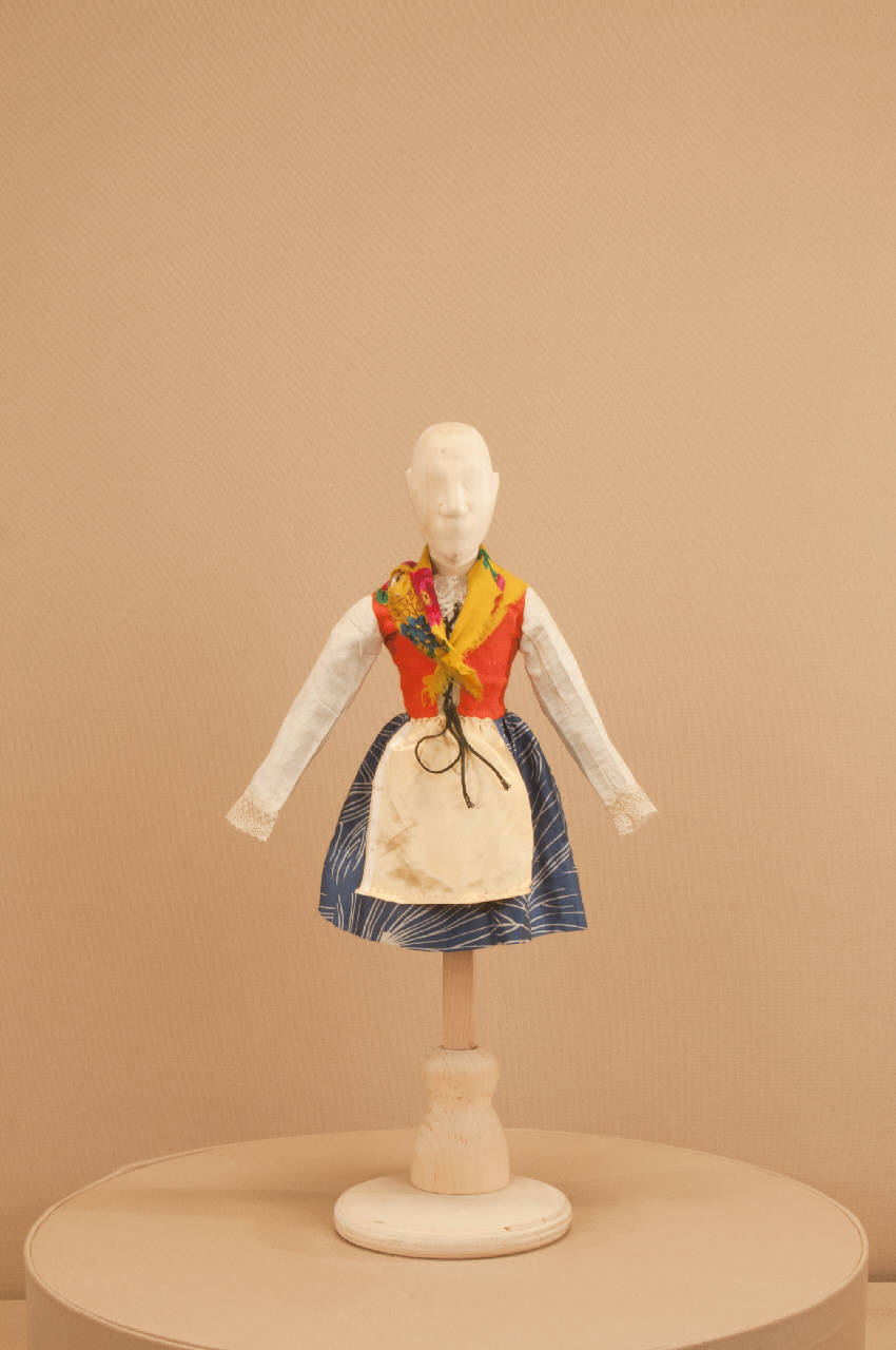 Costume da bambina popolana di foggia seicentesca per figurino composto da veste, sottogonna e scialle.