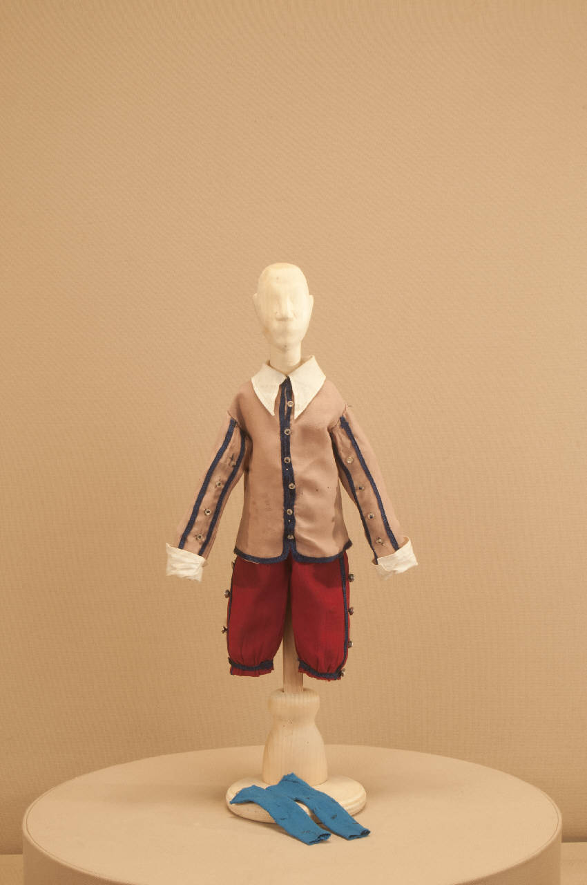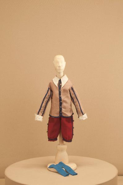 Costume da popolano di foggia seicentesca per figurino composto da calzoni, giacca e calze.
