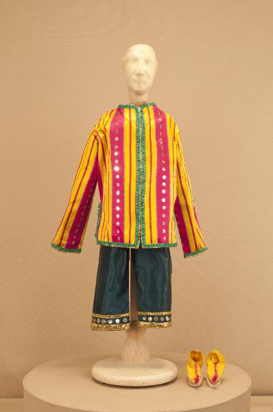 Costume fantastico cinese composto da pantaloni, giacca e scarpe.