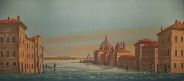 Scenografia composta da un fondale ed un'onda.Supporto in carta siling avana extra da 80 g. al mq. dipinto con colori a terra uniti con leganti vinilici e fortezzato con strisce in tela di cotone di diverse grammature lungo i bordi perimetrali e lungo le linee di piegatura.