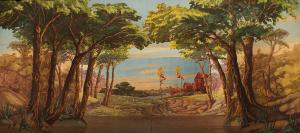 Scenografia composta da un fondale e tre principali ed un rompimento (terrazzino). Supporto in carta siling avana extra da 80 g. al mq. dipinto con colori a terra uniti con leganti vinilici e fortezzato con strisce in tela di cotone di diverse grammature lungo i bordi perimetrali e lungo le linee di piegatura. Fili di cotone annodati ad asole di fettuccia, permettono di reggere le parti sagomate del rompimento.