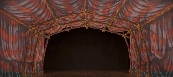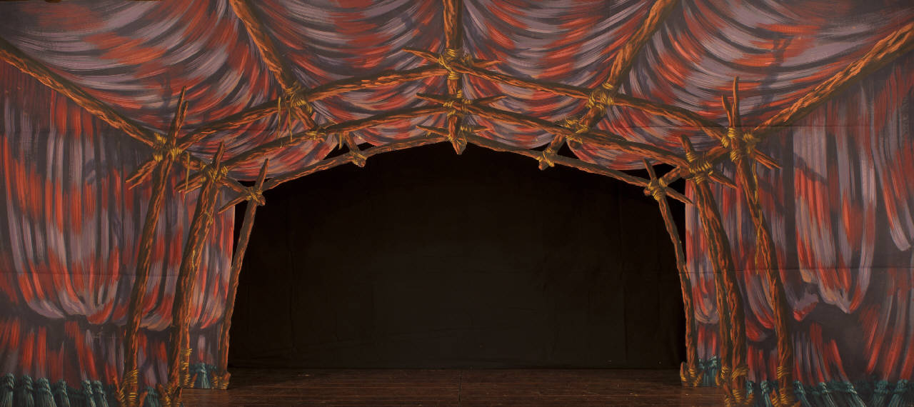 Scenografia composta da due soli principali.Supporto in carta siling avana extra da 80 g. al mq. dipinto con colori a terra uniti con leganti vinilici e fortezzato con strisce in tela di cotone di diverse grammature lungo i bordi perimetrali e lungo le linee di piegatura.