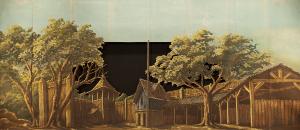 Scenografia composta da un solo principale.Supporto in carta siling avana extra da 80 g. al mq. dipinto con colori a terra uniti con leganti vinilici e fortezzato con strisce in tela di cotone di diverse grammature lungo i bordi perimetrali e lungo le linee di piegatura.