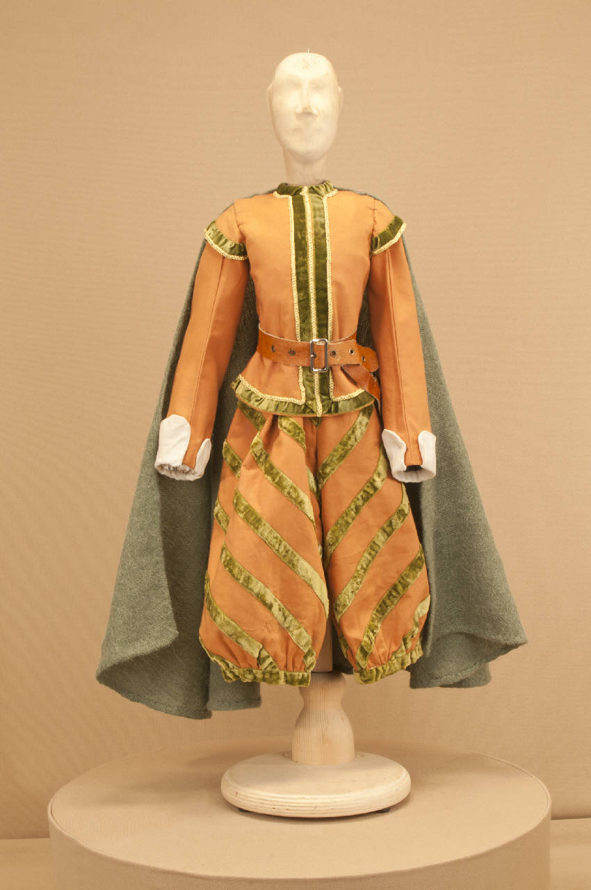 Costume per militare di foggia seicentesca composto da calzoni, giacca, cintura con portaspada e mantello.