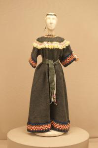 Costume folcloristico per donna pellerossa composto da veste, cintura e striscia in pelle per testa.