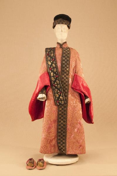 Costume da nobiluomo di foggia quattrocentesca composto da veste, corpino, fascia da appogiare sulla spalla, cappello e scarpe.