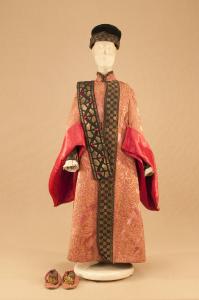 - NOTIZIE STORICO CRITICHE Il costume è stato confezionato nel 1935 per le riprese cinematografiche del film "I quattro Moschettieri" per il personaggio del Doge; in seguito il costume è stato usato per il personaggio del Giudice nello spettacolo "La Ginevra degli Almieri", in sostituzione di un vecchio costume usurato, di cui oggi rimane solo il cappello. La "Ginevra degli Almieri", ovvero "La Sepolta viva", è un adattamento per marionette dell¿omonima commedia scritta dall¿attore Luigi Del Buono, autore fiorentino della II metà del XVIII secolo ( 1751- 1832). È l¿inventore della maschera di Stenterello, che appare nel 1793 al Teatro del Cocomero di Firenze. Molte delle commedie scritte da Del Buono entrano nel repertorio del teatro delle marionette, come "Il diavolo mal maritato", "Stenterello viaggiatore e maestro di lingua italiana", "Il morto dal mantello rosso" e "I due gobbi". Il fenomeno si comprende poiché Del Buono aveva l¿abitudine di vendere ad altre compagnie e ad altri attori i suoi copioni. \nNel repertorio della Compagnia Colla la "Sepolta viva"è già presente dal 1835. Il manoscritto esistente risale al 1867, anno in cui il marionettista Testa Giovanni Domenico, collaboratore di Carlo Colla I, svolge la sua attività di copiatore, ricopiandolo da un testo precedente. \nSi presume che vada in scena nel repertorio della Compagnia Carlo Colla e Figli al Teatro Gerolamo, nei primi anni del XX secolo, epoca a cui possiamo far risalire i costumi; l¿ultima rappresentazione avviene il 18 Novembre 1956. \nUna curiosità riguarda le scenografie, poiché esistono due saloni settecenteschi che, malgrado la dicitura relativa alla commedia "Il matrimonio segreto", riportano in matita blu a grafia di Giovanni Colla, la dicitura "Ladro notturno". E¿ quindi possibile pensare che in qualche occasione fossero state commissionate per la "Ginevra degli Almieri" prima dell¿ambientazione in Firenze in epoca quattrocentesca. \nNel mondo marionettistico sparisce la scena IV, la scena V, la scena VI e la scena VIII del II atto; i personaggi dei soldati della scena X sono sostituiti dai becchini; sono tagliate la scena IV e parte della V del III atto. La vicenda viene completamente trasformata inglobando l¿atto IV con l¿ingresso del giudice che si raccorda con la scena II; è eliminata anche la scena IV, quella in cui Stenterello si finge avvocato.