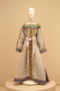 Costume folcloristico per donna pellerossa composto da veste, cintura e striscia in pelle per testa.