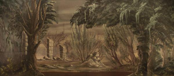 Scenografia composta da un fondale e un principale. Supporto in carta siling avana extra da 80 g. al mq. dipinto con colori a terra uniti con leganti vinilici e fortezzato con strisce in tela di cotone di diverse grammature lungo i bordi perimetrali e lungo le linee di piegatura.