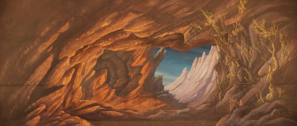 Scenografia composta da un fondale e due principali. Supporto in carta siling avana extra da 80 g. al mq. dipinto con colori a terra uniti con leganti vinilici e fortezzato con strisce in tela di cotone di diverse grammature lungo i bordi perimetrali e lungo le linee di piegatura.