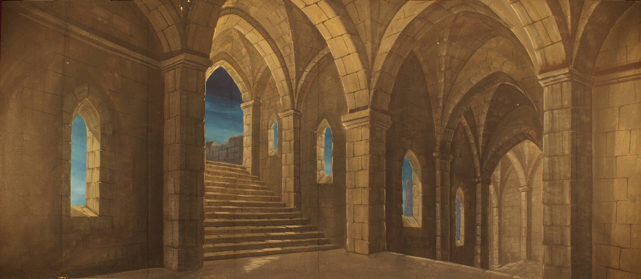 Scenografia composta da un fondale. Supporto in carta siling avana extra da 80 g. al mq. dipinto con colori a terra uniti con leganti vinilici e fortezzato con strisce in tela di cotone di diverse grammature lungo i bordi perimetrali e lungo le linee di piegatura.